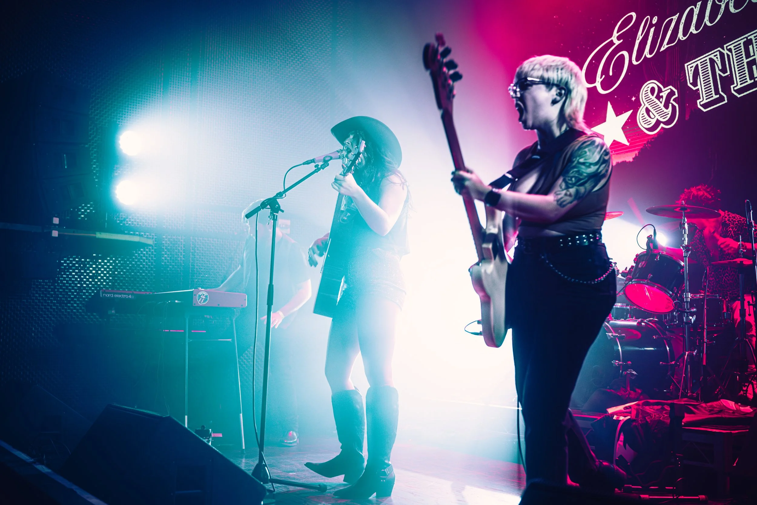 Musicians performing on stage with guitars, under dim lighting.